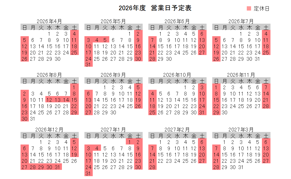 営業日カレンダー2026年度 営業日 カレンダー2025.11.13 土曜日・日曜日が定休日、祝日は営業日となっております。印刷する場合は、ボタンを押してから印刷して下さい2026年度営業日カレンダー営業日カレンダー2025年度 営業日 カレンダー